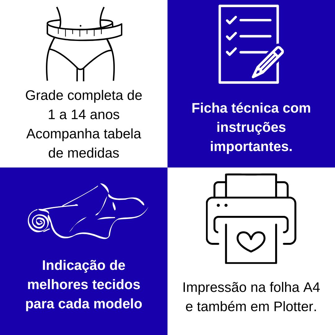 👉 Com nossos moldes, você economiza tempo, evita desperdício de tecido e acerta no tamanho logo na primeira costura.